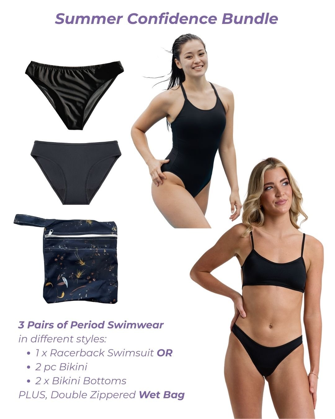 This bundle was made for carefree days at the beach, the pool or anywhere in between – no pads, no worries, no holding back. Everything she needs for summer and back to school swimming / school camps.